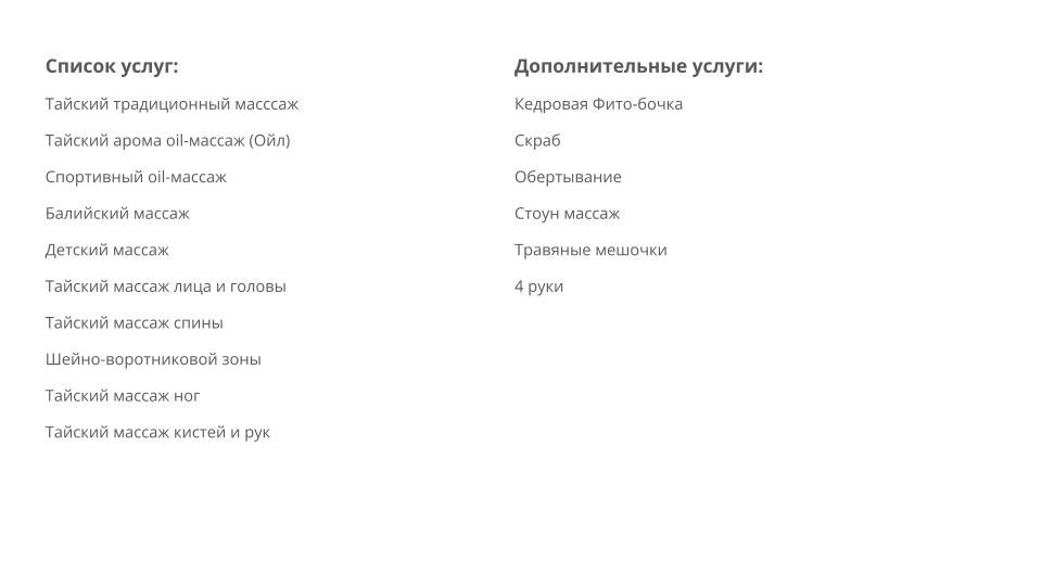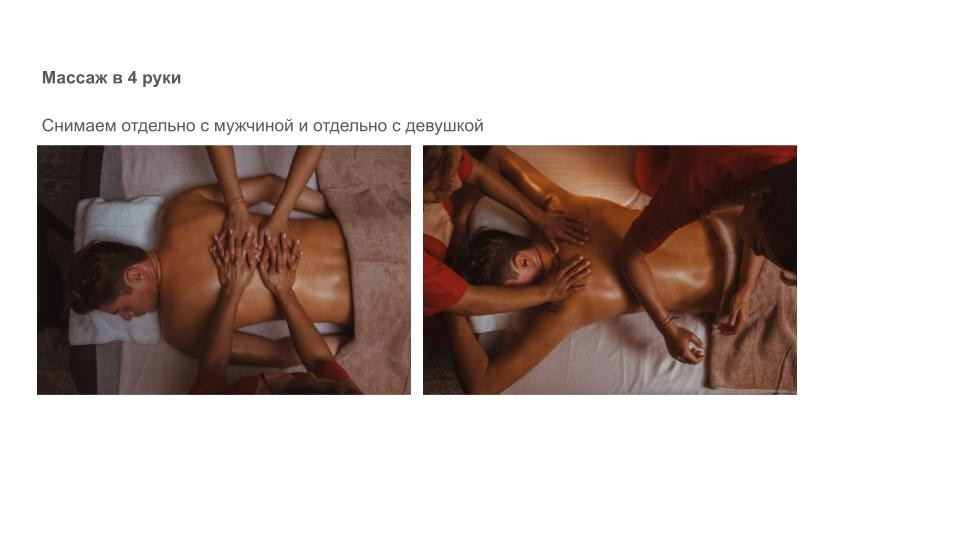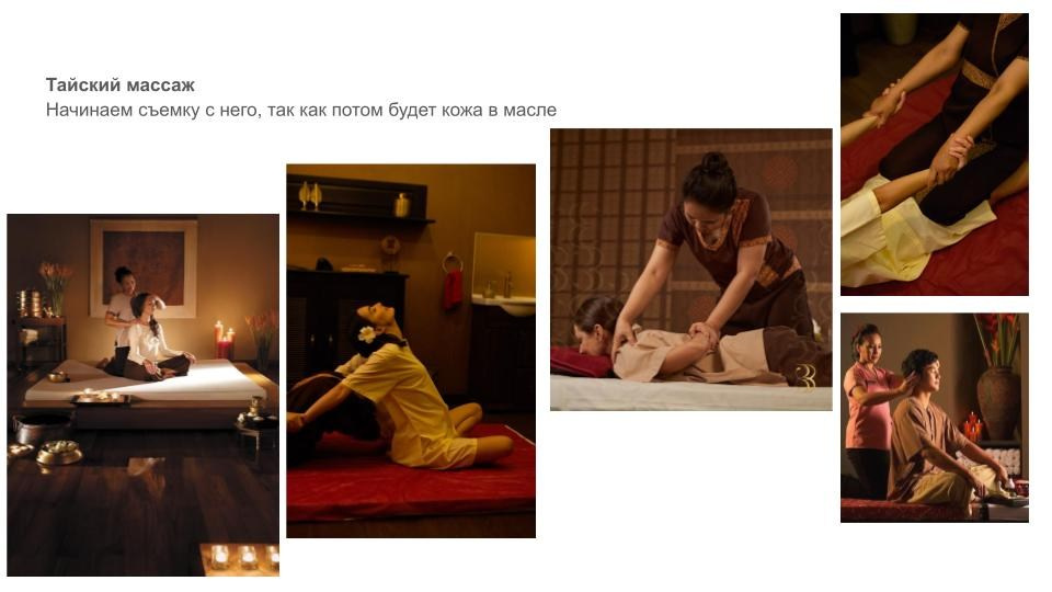 В этот раз задача стояла отснять ВСЕ услуги салона — тайский, балийский массаж, массаж в 4 руки. Спорьтивный и детский массаж и др.